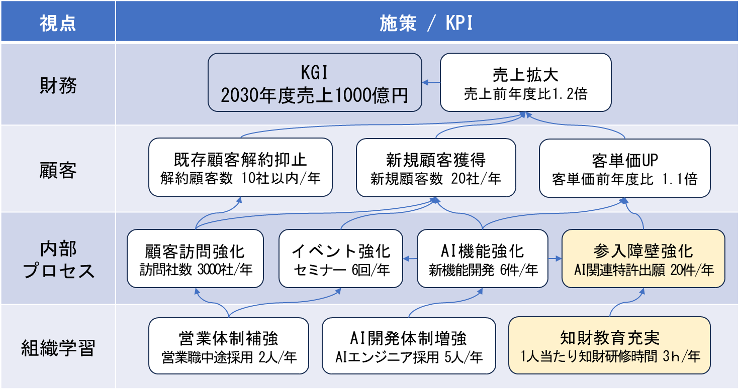 例として、AI機能を強化して売上拡大を目指すBtoB企業を想定し、考えてみたい。企業が掲げる最終的な目標数値、すなわちKGI(Key Goal Indicator 重要目標達成指標)が、「2030年までに売上1000億円」として、BSCの枠組みの各視点における施策とそのKPIを設定したものが下図である。